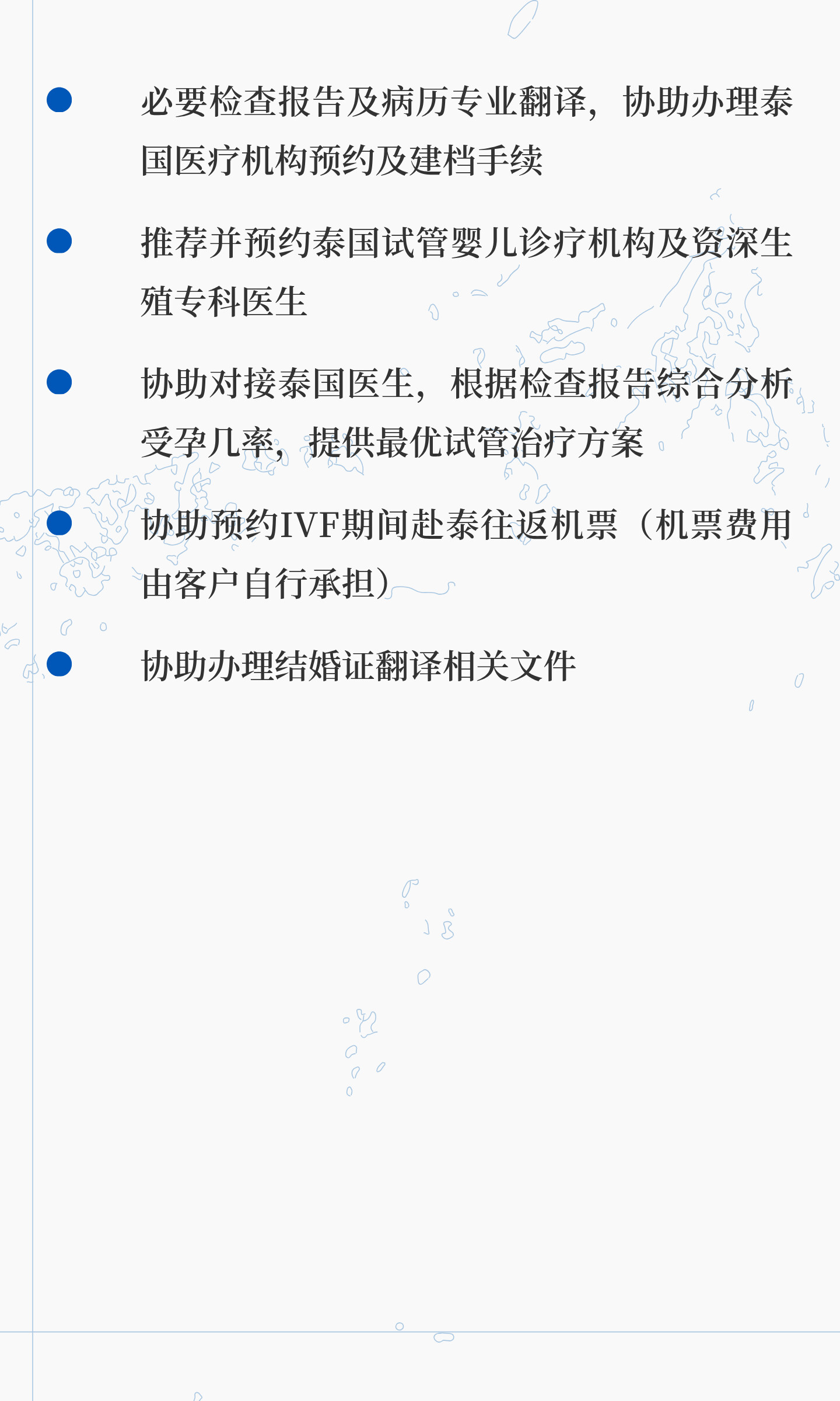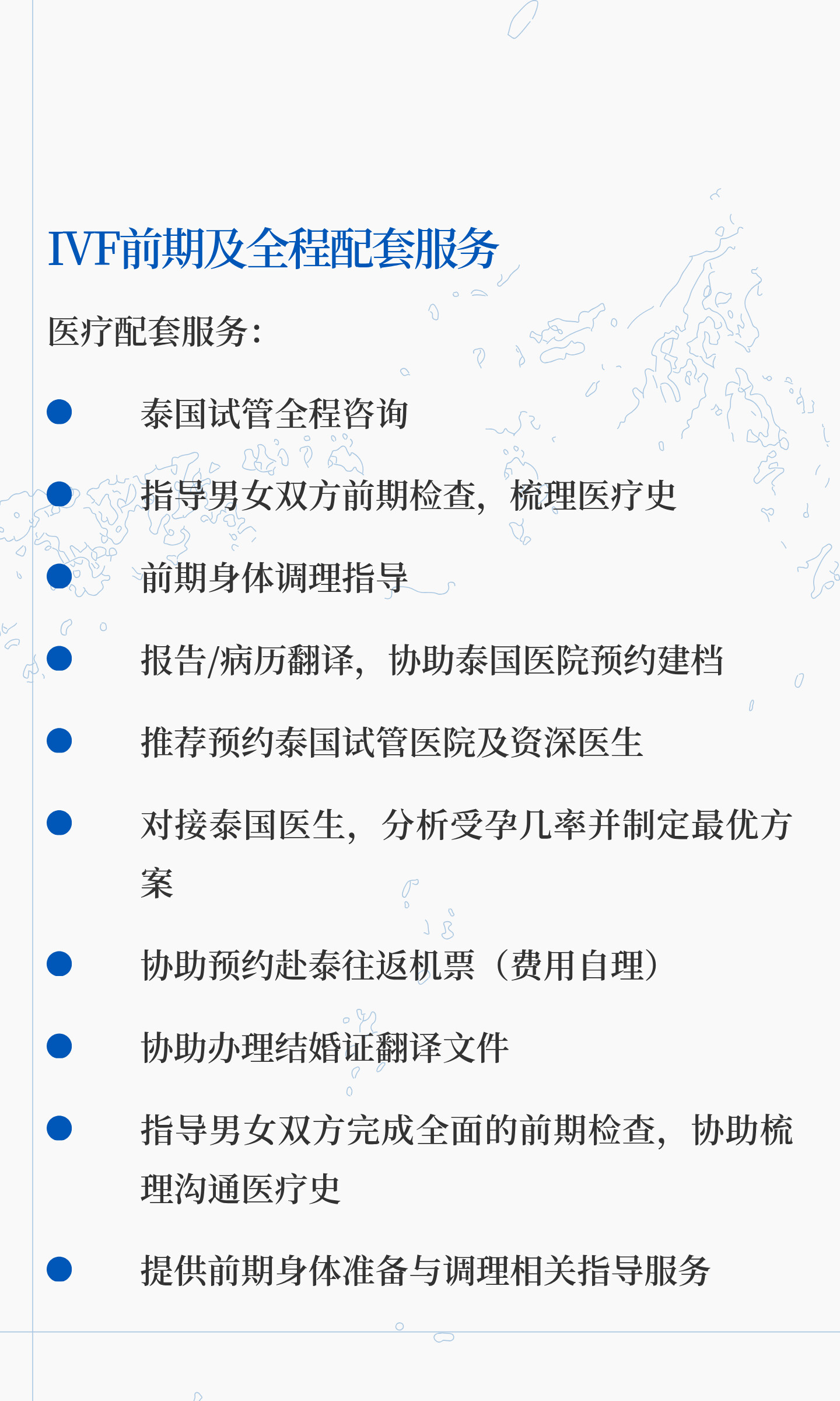 试管纯服务套餐¥6000IVF前期服务医疗部分:• 泰国全程试管咨询服务• 指导全面的男女双方前期检查、沟通医疗史• 前期身体准备与调理指导相关服务• 必要检查