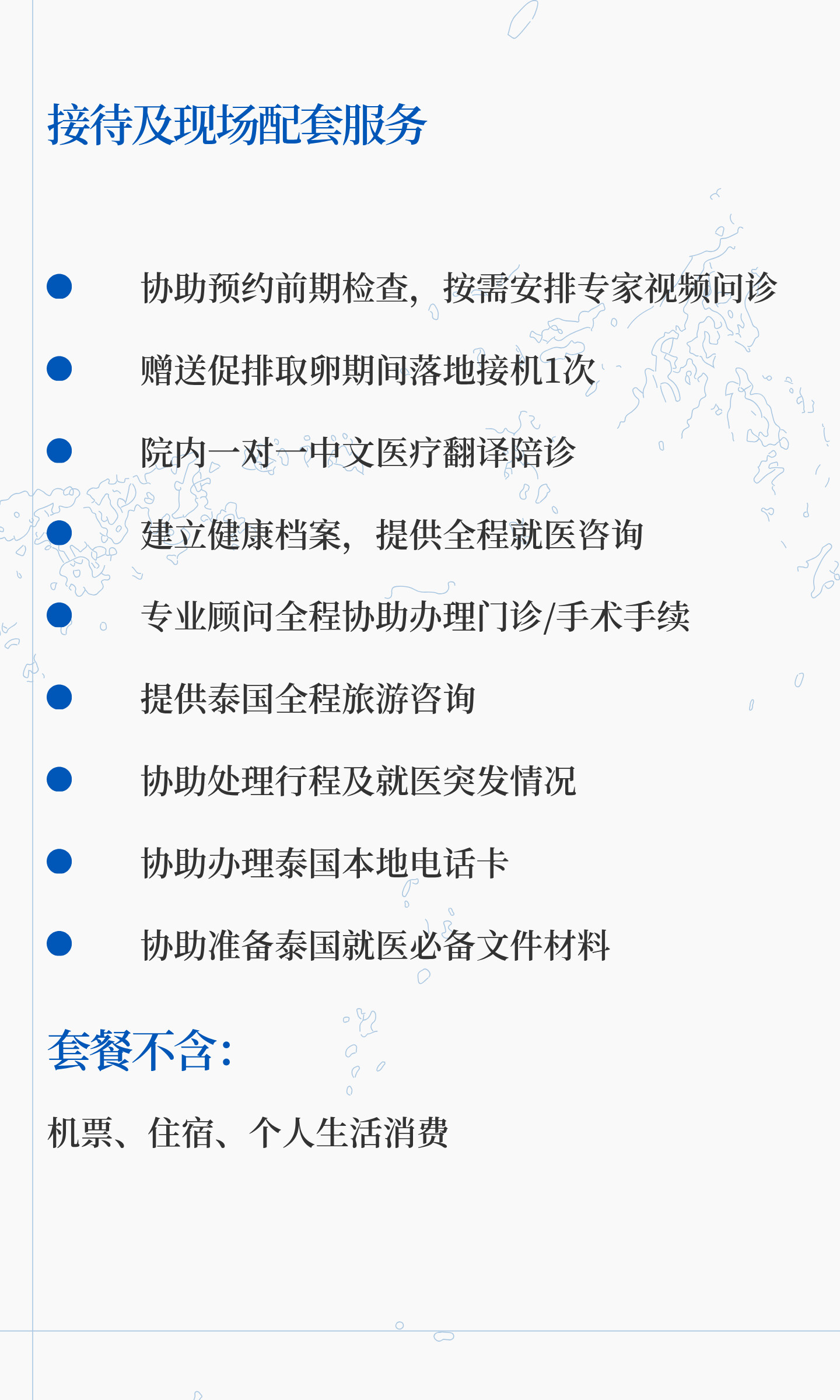 泰国冻卵纯服务套餐¥4000冻卵前期及全程配套服务医疗配套服务:泰国冻卵全程咨询指导女方前期检查,梳理医疗史前期身体调理指导报告/病历翻译,协助泰国医院预约建档