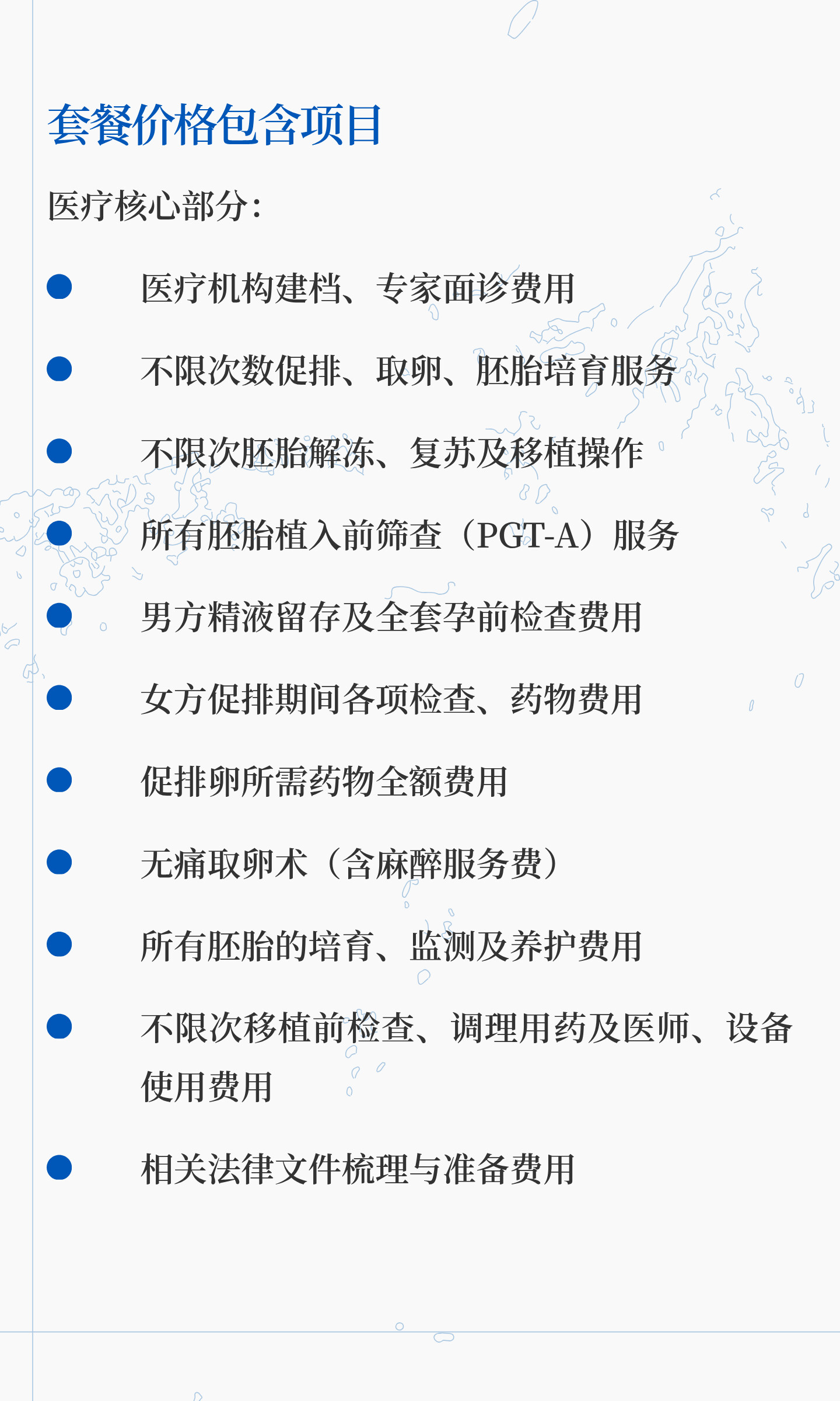 三代无忧优选套餐(不限次促排培育+不限次移植着床)套餐价格包含项目医疗核心部分:医疗机构建档、专家面诊费用不限次数促排、取卵、胚胎培育服务不限次胚胎解冻、复苏及