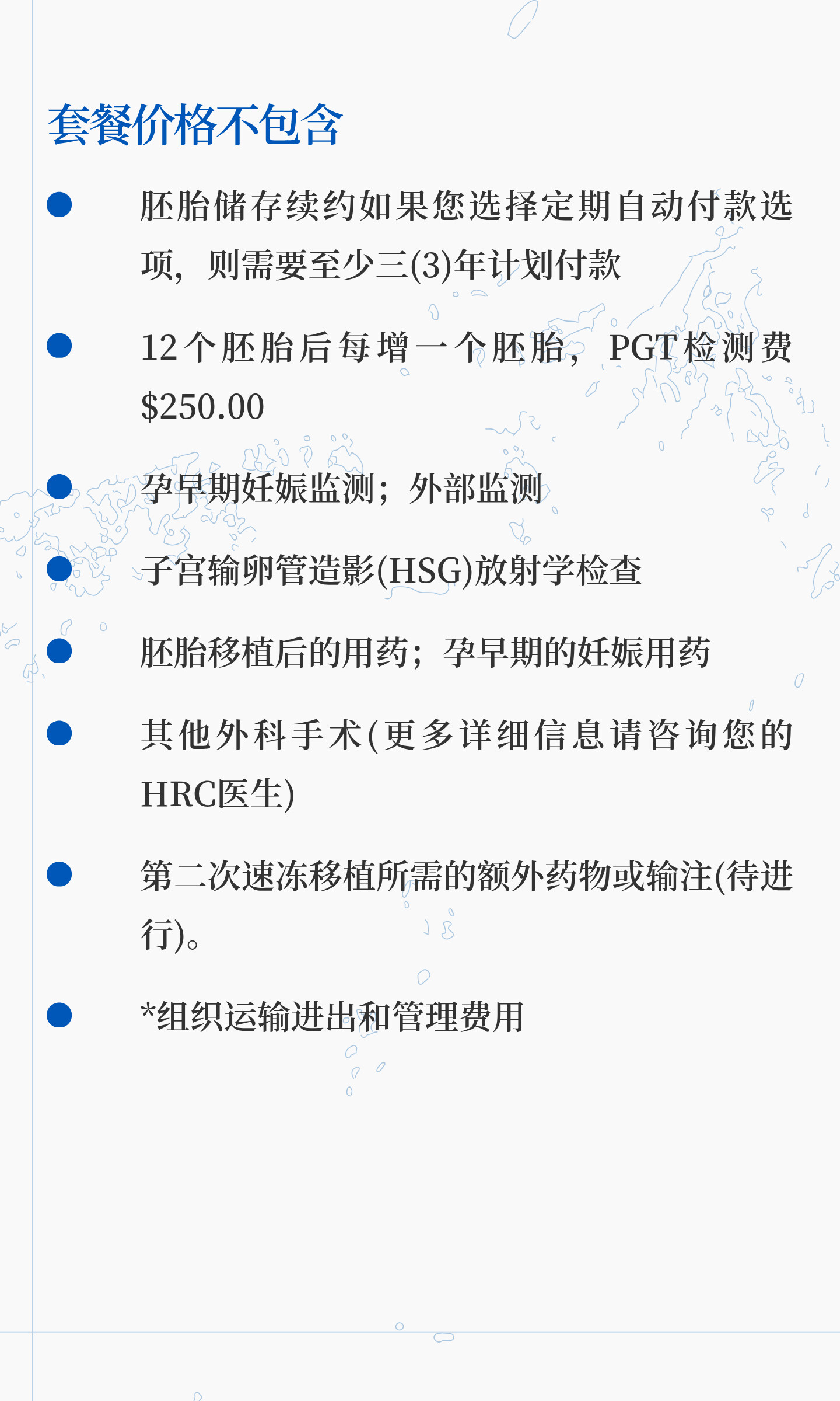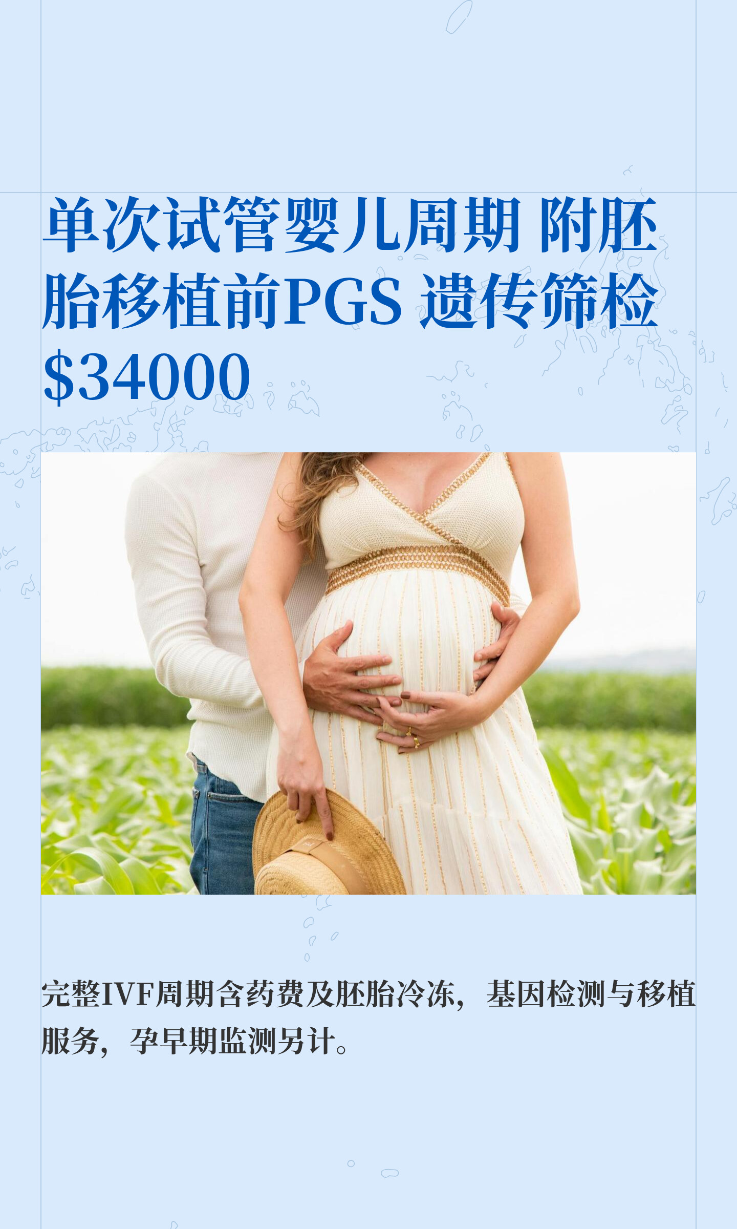 完整IVF周期含药费及胚胎冷冻,基因检测与移植服务,孕早期监测另计。