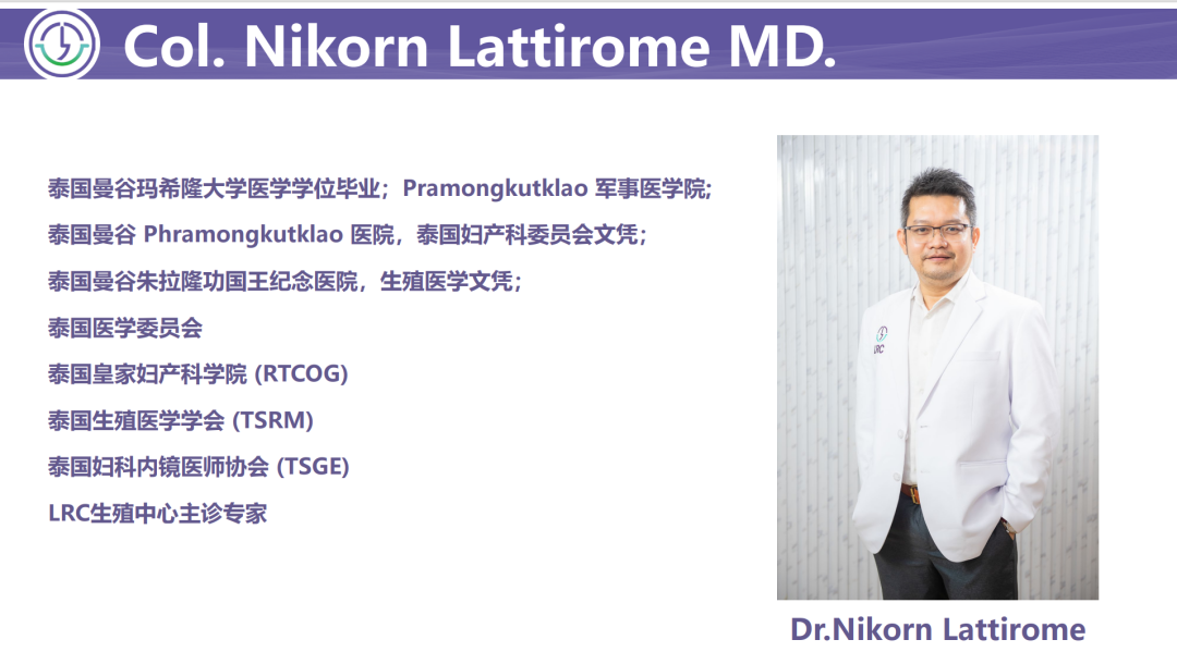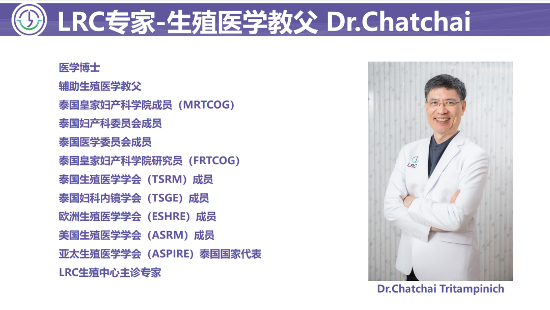 1997年,LRC生殖中心由泰国卫生部外事局局长、泰国皇室蒙拉查翁·沃拉芭帕·扎伽潘亲王殿下主持创建。由泰国资深专家组成,汇聚了泰国囊胚之父(Sawat)、 辅助生殖教授(Chatchai )、顶尖医学博士(Nikorn)、人类胚胎学家(Teewara)等生殖领域资深专家。20余年来,LRC生殖中心诊治超过2万名患者。至今2100对IVF周期,囊胚养成功率87.2%,移植成功率79.2%。